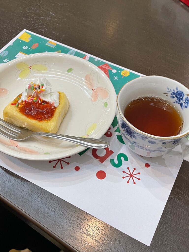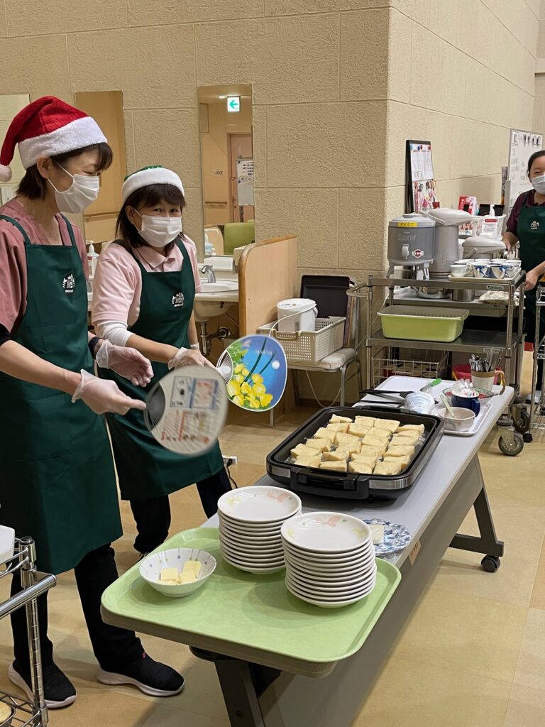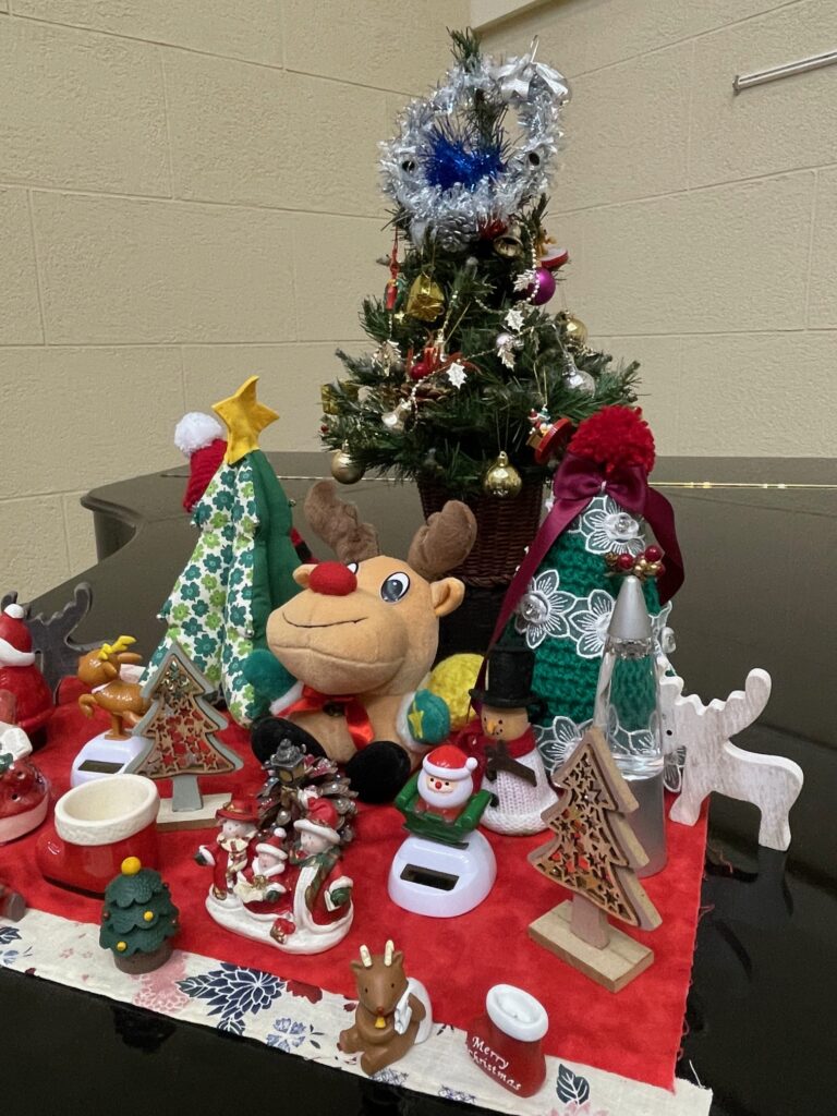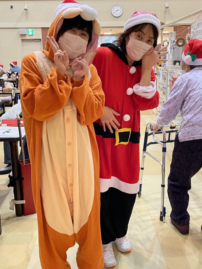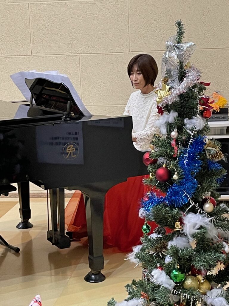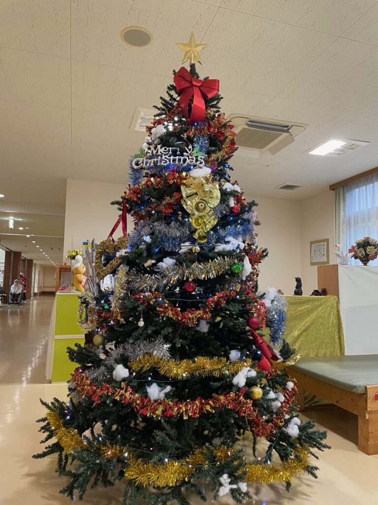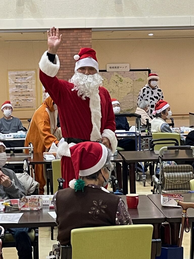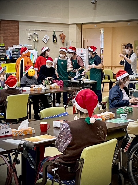 もえぎ野デイケアではクリスマス会を行いました🎅 クリスマスケーキならぬクリスマスフレンチトーストの甘い香りが漂う中、クリスマスソングのピアノ演奏♬ サンタクロースや謎の動物たちに扮したスタッフとにぎやかに楽しいひと時を過ごしました💓 あまーい香りが漂います💓 やたら陽気なサンタクロース サンタクロースとりす?くま? 幸せな気持ちになるクリスマスソング生演奏♪ 嗅覚でもたのしんでもらい隊 メインエントランスには今年も巨大なクリスマスツリー